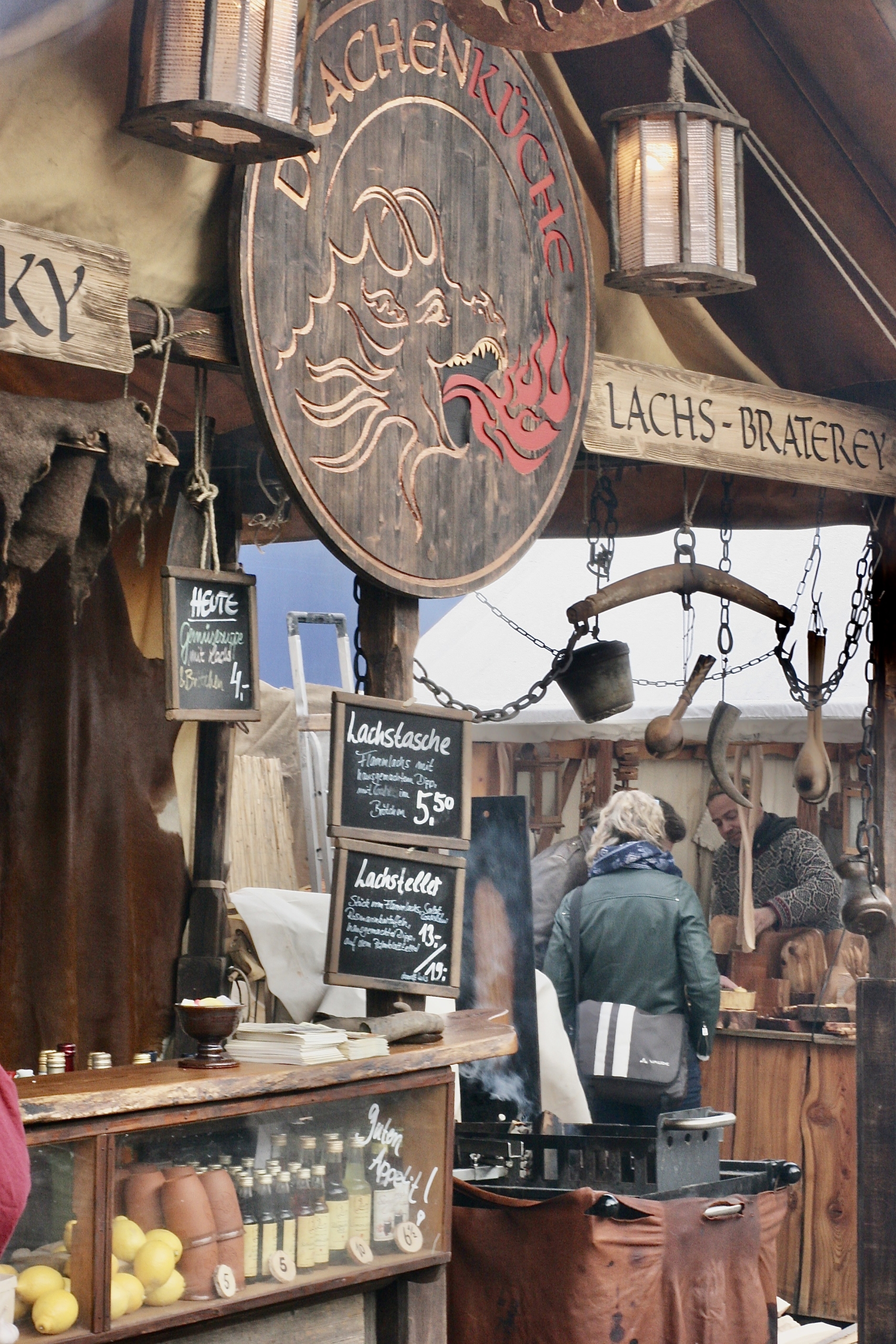 Flammlachs auf offenem Feuer zubereitet im Brötchen dazu Backofenkartoffeln mit Dips, Suppen und Heißer Winkinger ( der beste Whiskypunsch der Welt) werden hier liebevoll von Hand zubereitet.